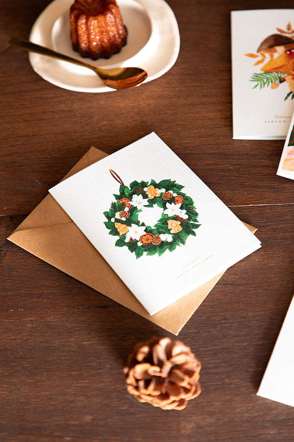 🎄 Timeless elegance for the holidays. The Couronne Chic greeting card by All the Ways to Say showcases a lush Christmas wreath adorned with pinecones, gingerbread cookies, and delicate florals. The refined design is enhanced with gold foil details, adding a festive sparkle to your holiday wishes.