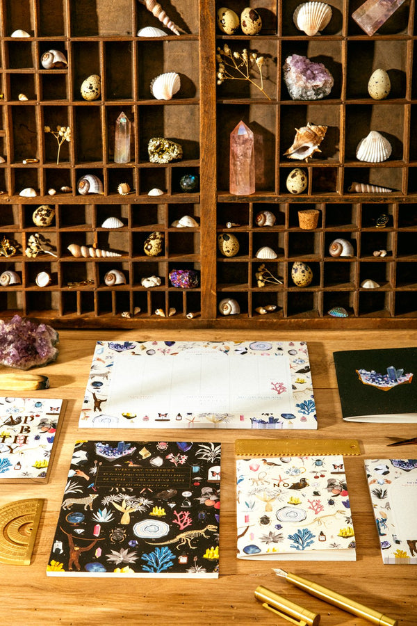 🔮📓 The Curiosity Pocket Notebook A6 Duo by All the Ways to Say sparks imagination with two unique designs: one adorned with whimsical natural elements, animals, and objects, and the other featuring a striking geode floating in a starry sky. Enhanced with gold foil details, this set combines creativity and elegance in pocket-sized form.