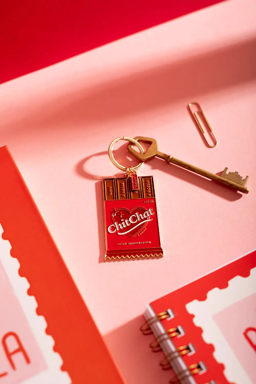 Add a delicious touch of irony to your keys with the Chit chat — Keychain by All The Ways To Say. Inspired by a famous chocolate bar, this gold enamel accessory features a witty twist with the messages "HAVE A BREAK HAVE A GOSSIP" and "CRISPY ATTITUDE INSIDE". With its vibrant red wrapper and shining gold finish, it’s the perfect statement piece for those who know that life is better with a little bit of talk and a lot of style.