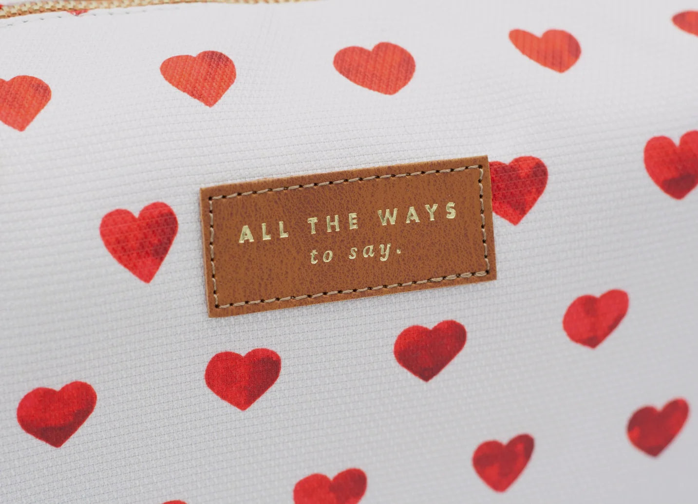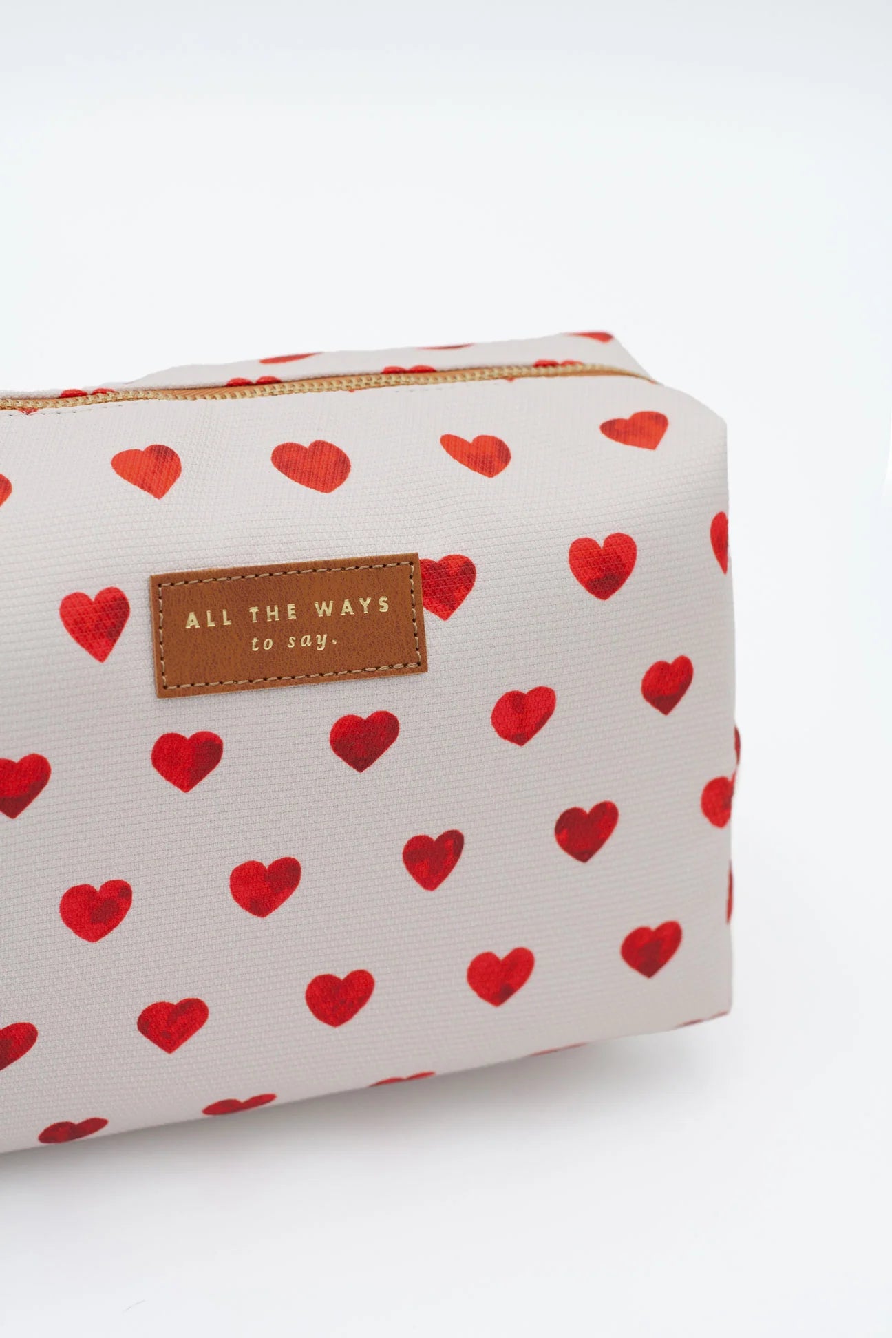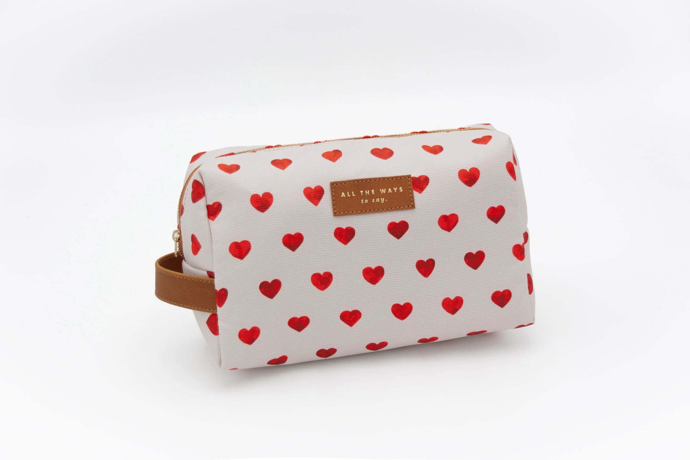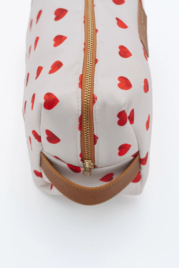 The F*cking Cute Toiletry Bag by All the Ways to Say is a limited edition piece that turns everyday organization into a playful declaration of style. Covered in a vibrant red hearts pattern on a soft cream background, it radiates charm and personality. Finished with a gold embossed vegan leather tag, this toiletry bag blends a fun and trendy look with careful craftsmanship.