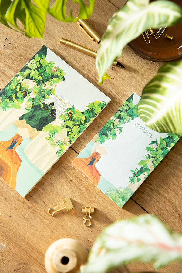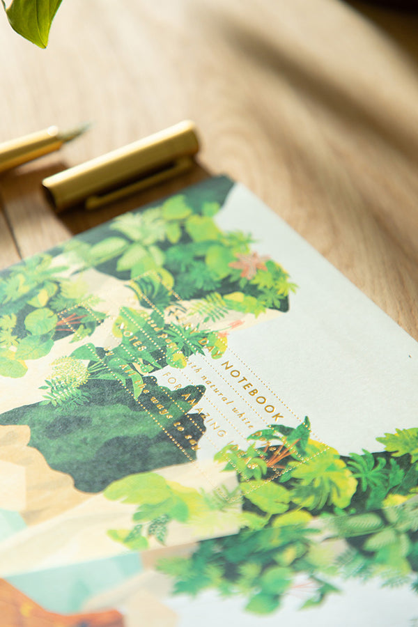Le carnet Bay A5 d’All the Ways to Say illustre une scène apaisante d’une barque glissant entre des falaises tropicales, portée par une atmosphère contemplative. Rehaussé de dorure, son design inspire autant l’évasion que la sérénité.