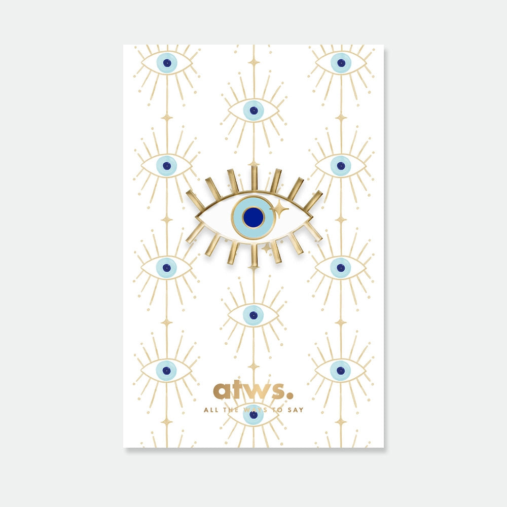 Éloignez les mauvaises ondes avec le Pin's Blue Eye par All The Ways To Say. Cet accessoire percutant arbore un design d'œil porte-bonheur rayonnant, sublimé par une finition en émail doré éclatant et des détails bleu profond. Présenté sur une carte illustrée assortie reprenant le motif de l'œil, ce pin's apporte une touche symbolique et mystique à votre veste en jean, votre revers de manteau ou votre sac préféré.