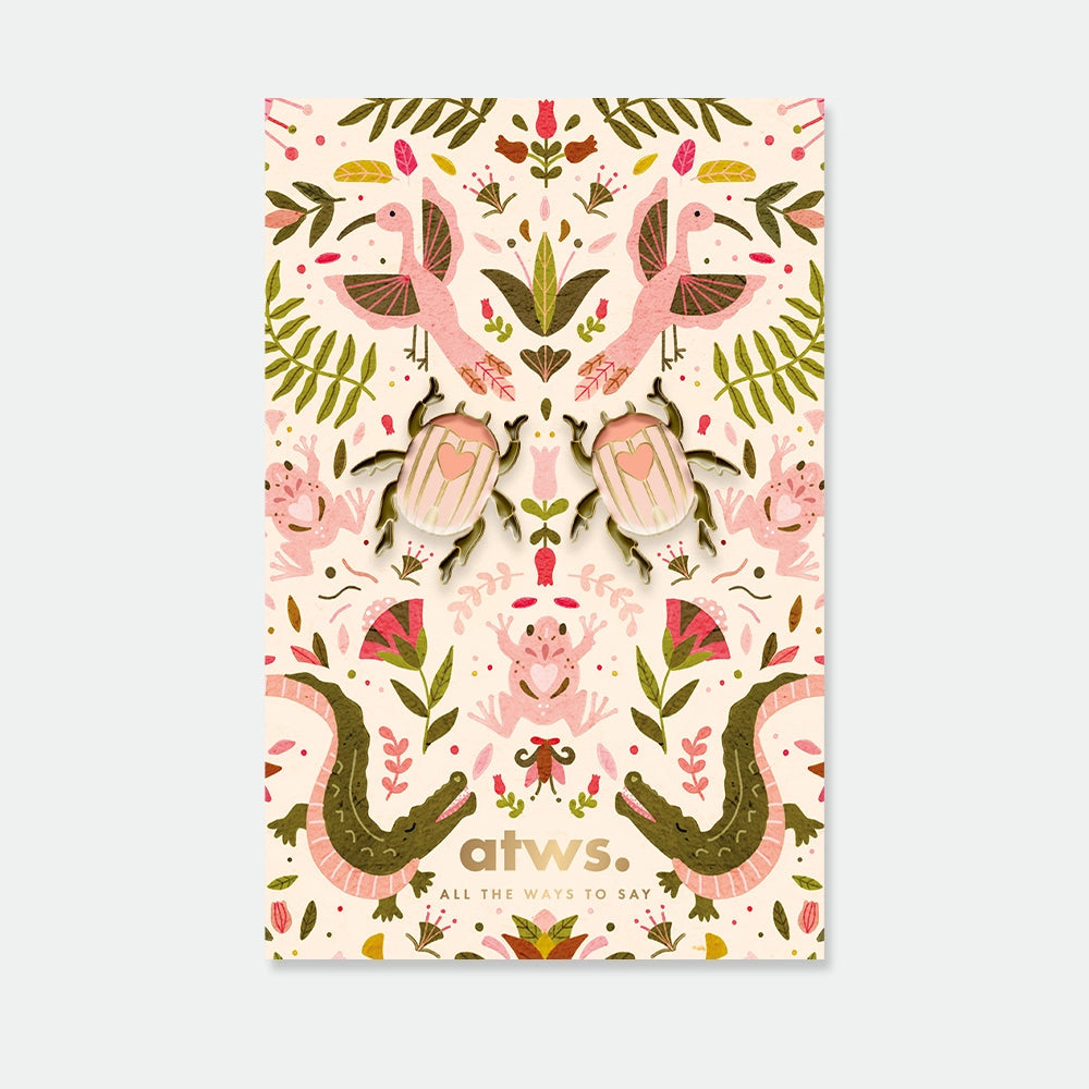 Laissez-vous envoûter par le charme du monde sauvage avec le Pin's Duo Scarabée par All The Ways To Say. Cet ensemble charmant se compose de deux scarabées roses symétriques, chacun orné d'un délicat petit cœur sur le dos et d'une finition en émail doré éclatant. Présenté sur une superbe carte illustrée aux motifs botaniques peuplés d'oiseaux roses, de grenouilles et de crocodiles, ce duo est idéal pour ajouter une touche d'élégance symétrique à vos revers, sacs ou cols.