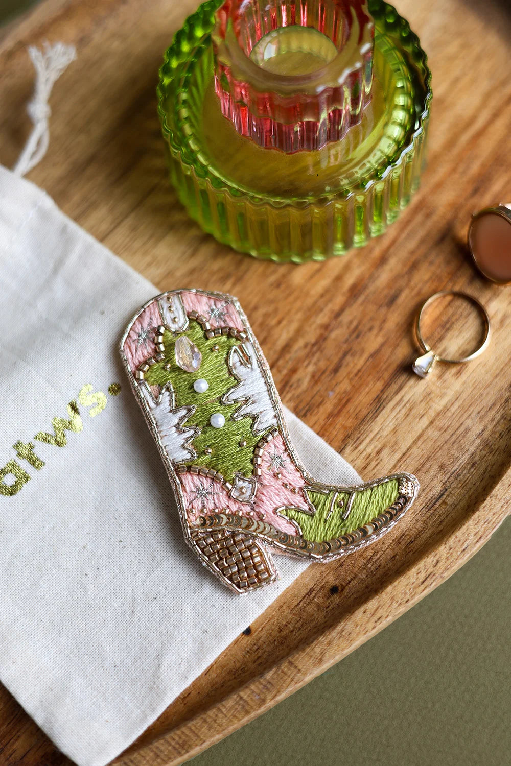 La broche Santiag de All the Ways to Say est un hommage charmant à l'esprit pionnier. Ce petit chef-d’œuvre brodé à la main représente une botte de cowboy stylisée aux nuances de rose poudré et vert éclatant, rehaussée de sequins scintillants. Avec ses dimensions de 70 x 50 mm, elle apporte un vent de fraîcheur et d'originalité à une veste en jean, un manteau ou un sac.