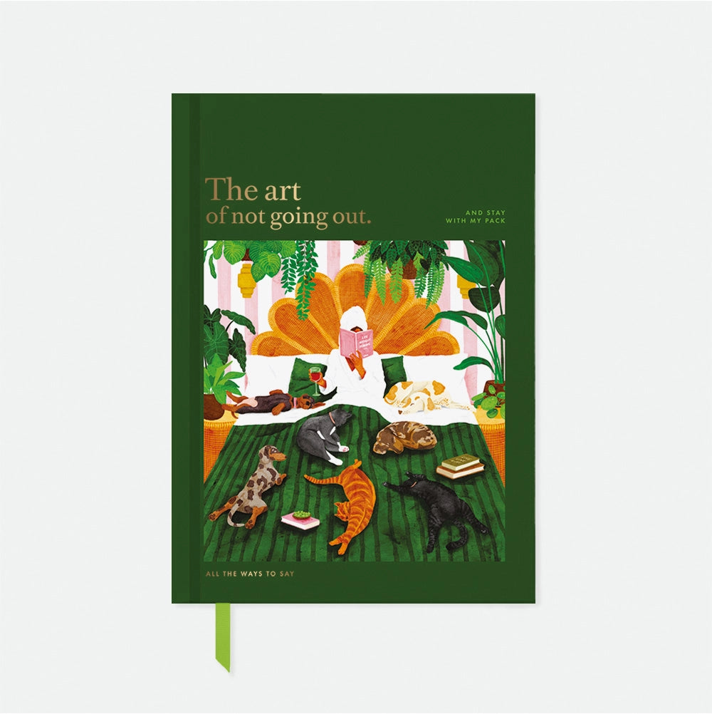 Le carnet couverture rigide A5 The Art of Not Going Out de All the Ways to Say célèbre le plaisir simple de rester chez soi. Sa couverture vert forêt présente une illustration foisonnante peinte à la main, mettant en scène un sanctuaire de douceur : un bon livre, un verre de vin et toute une meute d'animaux de compagnie. Des détails en dorure à chaud et un marque-page ruban assorti apportent une touche raffinée à cette couverture rigide. À l'intérieur, 220 pages lignées en papier de qualité supérieure offrent un support idéal pour vos notes, votre organisation ou vos réflexions quotidiennes.