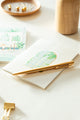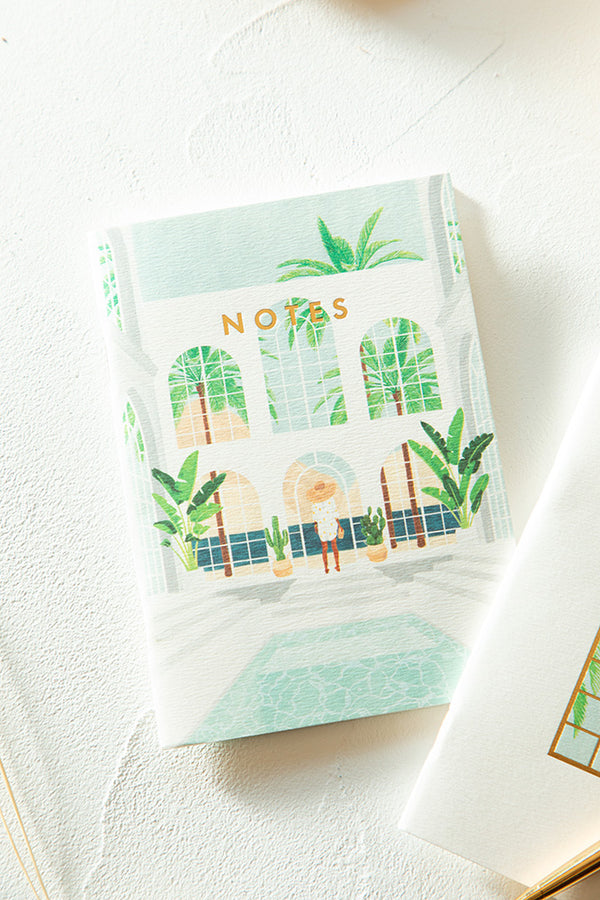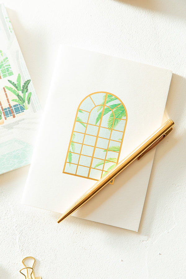 🌿📓 Le duo de carnets de poche White House A6 d’All the Ways to Say associe deux designs complémentaires : l’un illustrant une architecture baignée de lumière avec arches, plantes et piscine, l’autre représentant une fenêtre dorée ouvrant sur une végétation luxuriante. Un duo compact qui conjugue sophistication et apaisement.
