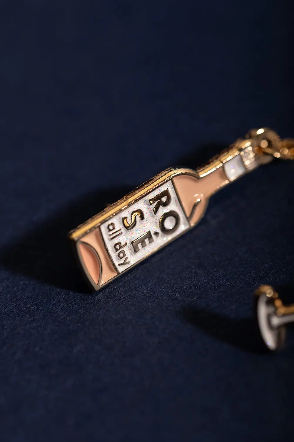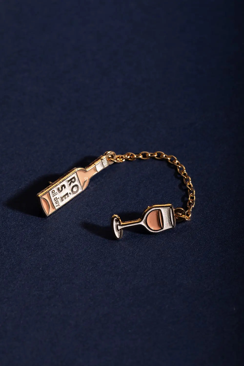 Célébrez l'esprit de l'été et de la convivialité avec le Pin's Duo Rose All Day Chain par All The Ways To Say. Cet ensemble élégant se compose d'une bouteille de rosé élancée gravée de l'inscription "ROSE all day" et d'un verre délicat, tous deux sublimés par une finition en émail doré de haute qualité. Reliés par une chaîne dorée de 42 mm, ces pin's créent un effet "service" ludique une fois épinglés à votre revers de veste ou votre col. Présenté sur une superbe carte illustrée à l'aquarelle montrant des mains levées pour un toast, c'est l'accessoire parfait pour les amateurs de bons moments.