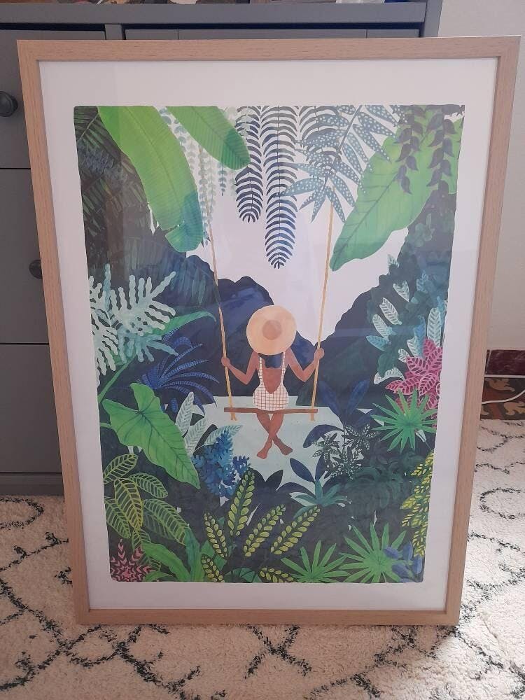 Let your imagination soar with Swing. This enchanting poster features a lady on a swing, suspended in a heavenly place surrounded by lush tropical plants 🌿🌸.